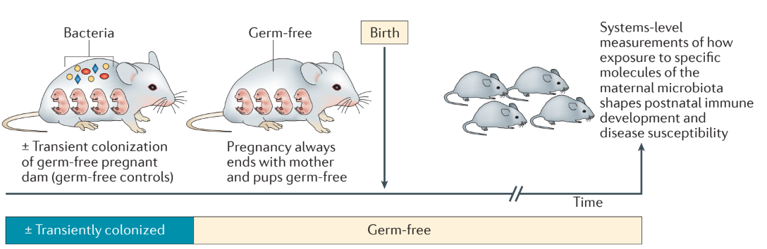 Le prime evidenze che hanno consentito di delucidare questo meccanismo derivano da questi esperimenti che utilizzano un ceppo ingegnerizzato di E. coli (E. coli HA107). Si tratta di un ceppo auxotrofico (senza un particolare nutriente essenziale ha sopravvivenza limitata a 24-72 ore) e quindi in grado di colonizzare transitoriamente topine gravide germ-free.Grazie alla natura transitoria del batterio HA107, la madre torna a essere "germ-free" prima di partorire. Di conseguenza i cuccioli nascono e restano privi di microbi (germ-free). Poiché i cuccioli non hanno microbi propri, qualsiasi differenza osservata nel loro sistema immunitario rispetto a cuccioli nati da madri mai colonizzate deve essere attribuita esclusivamente all'esposizione materna al batterio avvenuta durante la gravidanza. Quello che si osserva è appunto che i cuccioli nati da madri colonizzate transitoriamente con questo singolo ceppo di E. coli mostrano uno sviluppo immunitario molto simile a quello di cuccioli nati da madri con un microbiota complesso e diversificato (standard).